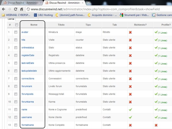 2) Andiamo nel field manager CB e prendiamo nota dei nomi (non dei titoli) dei vari campi che abbiamo creato e che ci interessa integrare (vedi foto)